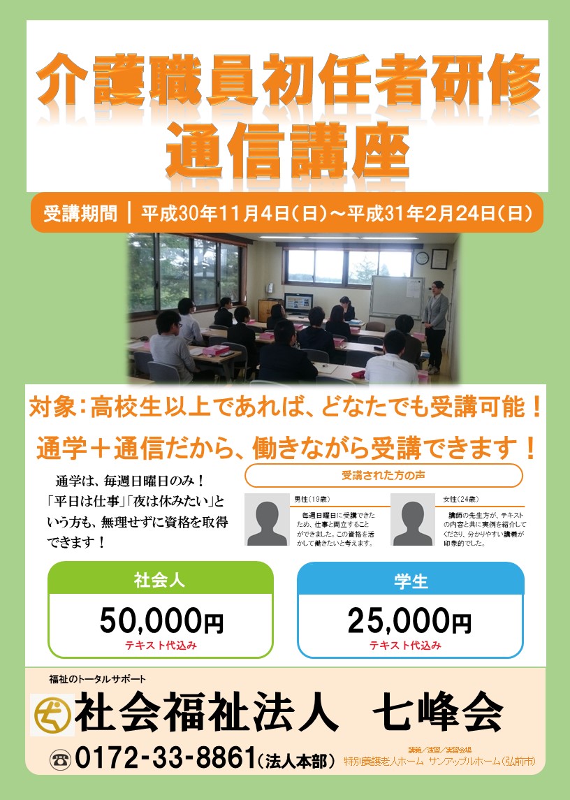 七峰会では青森県の指定を受け、『七峰会介護職員初任者研修通信講座』を開講しています。 福祉や介護の職場に従事しようとお考えの方や、ご家族のために介護の知識や技術を身に着けたい方など、高校生以上であれ ... 続きを読む