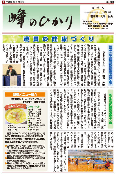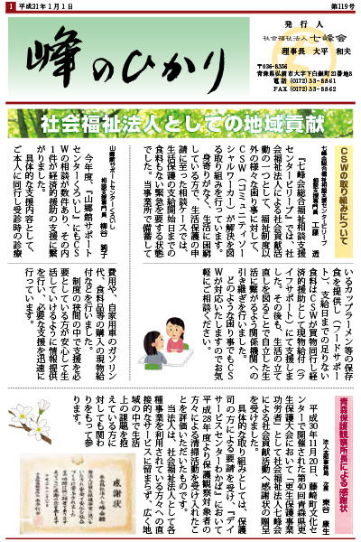七峰会の各グループで行っているイベントや、福祉に関する情報などをお知らせしている広報誌「峰のひかり」の最新号(2019年2月20日発行 第120号)を掲載致しました。 ぜひご覧下さい。 「峰のひかり ... 続きを読む