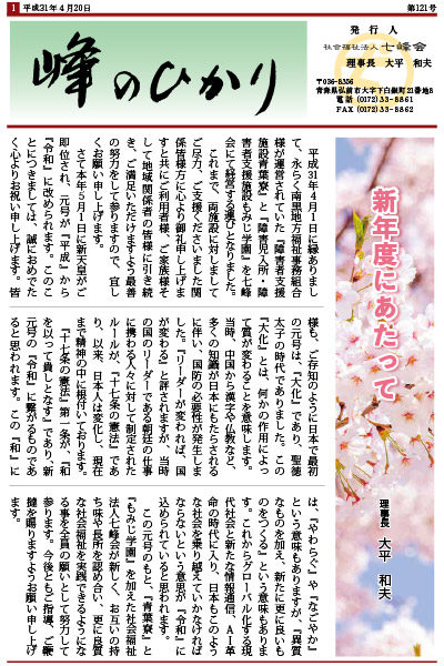 七峰会の各グループで行っているイベントや、福祉に関する情報などをお知らせしている広報誌「峰のひかり」の最新号(2019年4月20日発行 第121号)を掲載致しました。 ぜひご覧下さい。 「峰のひかり ... 続きを読む